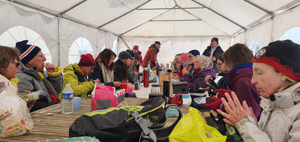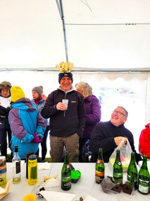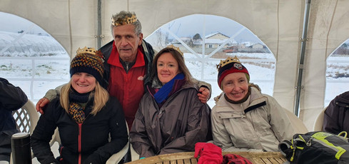 Pour nous réchauffer, surprise du Marco qui nous réserve un superbe accueil et nous installe sous un chapiteau avec chauffage d'appoint. Après le casse-croûte,boissons,gâteaux,chocolats,café, voici la commission convivialité qui apporte le cadeau que nous attendions tous : les excellentes GALETTES accompagnées de leurs cidres.Les reines et rois se sont "bousculés" pour être sur les photos, surtout après le petit plus que nous avait réservé notre guide: la VERVEINE du FOREZ et son petit Ferrero rocher, précieux breuvage très apprécié vue la saison.