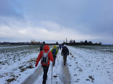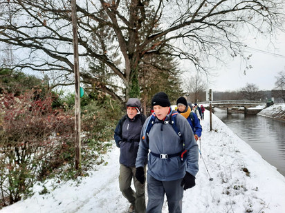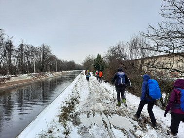 Notre Marco nous attendait bon pied bon œil chez lui à la Verveine du Forez, malgré la température de saison, un sol blanchi et un ciel bas. C'est un groupe motivé, digne d'une journée de la rando/galette qui part de Bonson. Après la mise en jambes, nous longeons le canal du Forez et traversons la passerelle qui enjambe le bonson, puis arrivés à Chavas, nous enchaînons par la traversée de Grillet et ensuite prenons le chemin de l' Hospitalet. Nous voici partis pour la descente dans le vallon pour arriver à la voie verte (ancienne voie de chemin de fer qui reliait Senbabel à Bonson). Cette voie verte nous conduit aux Plantées à Saint-Marcellin,et nous arrivons quelque peu frigorifiés au chemin des lièvres à Bonson, fin de notre boucle de 15 km.